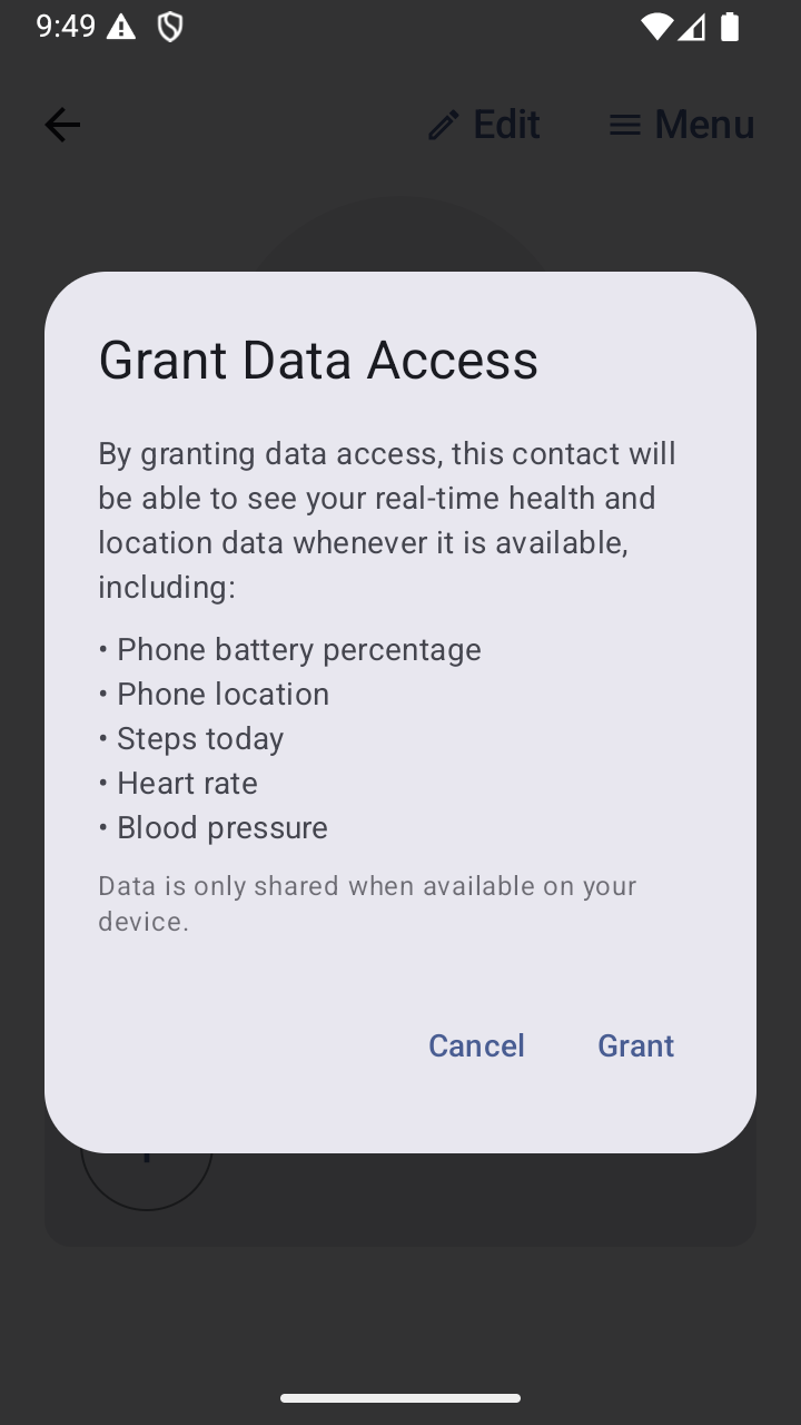 Securely share vital information with caregivers to allow for remote monitoring of your health and well-being. This can include your phone's battery level, location, daily steps, heart rate, and blood pressure (if available).